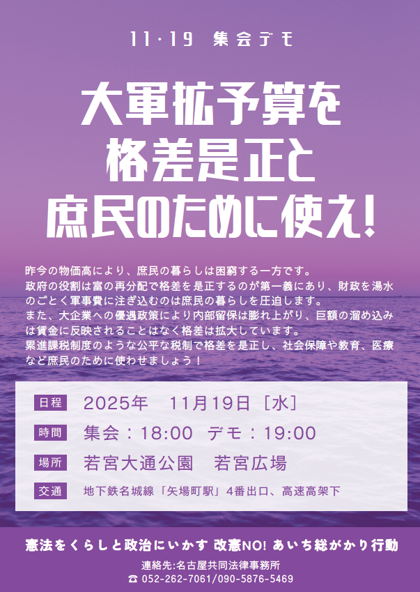 愛知総がかり行動は10月19日、名古屋駅、栄、金山を始め県下で行われました。 金山は、愛労連と革新懇が担当、19名が参加。カンパも寄せられ、総がかり行動に入会者もありました。 40代の方は鹿児島の知覧の出身で「戦争は絶対ダメ」と。チラシ1…